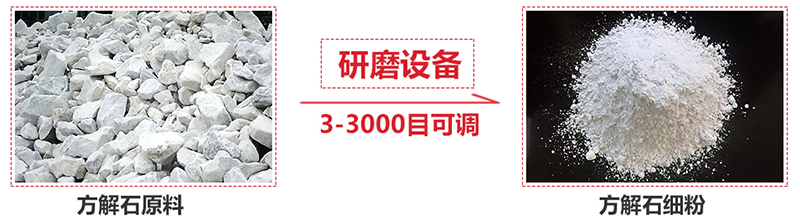我們把方解石大塊物料經(jīng)破碎機(jī)破碎到能進(jìn)入磨粉機(jī)的入料細(xì)度(15mm-50mm),經(jīng)過破碎后的方解石小塊物料經(jīng)提升機(jī)送至料倉,再經(jīng)振動(dòng)給料機(jī)將其均勻定量的送入磨機(jī)研磨室內(nèi)進(jìn)行研磨。