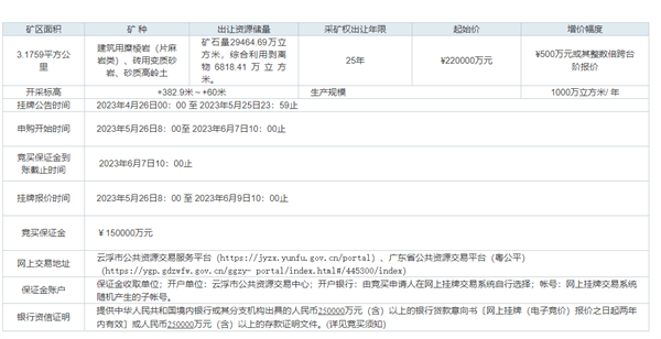 另外,采礦權出讓礦區(qū)面積3.1759平方公里(4763.84畝),礦區(qū)開采范圍內(nèi)的土地以租賃方式使用。土地的租金、青苗補償款等費用合計人民幣70000萬元,由競得人承擔并在簽訂《非油氣采礦權出讓合同》后,在2023年7月30日前支付第一期款項人民幣35000萬元到云浮市云城區(qū)財政局指定銀行賬號,第二期在2023年10月30日前繳納剩余款項人民幣35000萬元。云浮市云城區(qū)人民政府負責協(xié)調(diào)完成礦區(qū)范圍(3.1759平方公里)租地后交由采礦權競得人使用,具體租地情況由競買申請人自行向云浮市云城區(qū)人民政府了解。